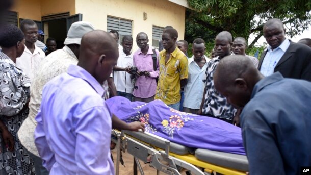 FILE - Relatives and other mourners watch as the body of South Sudanese journalist Peter Julius Moi is taken into the mortuary in Juba, South Sudan, Aug. 20, 2015.
